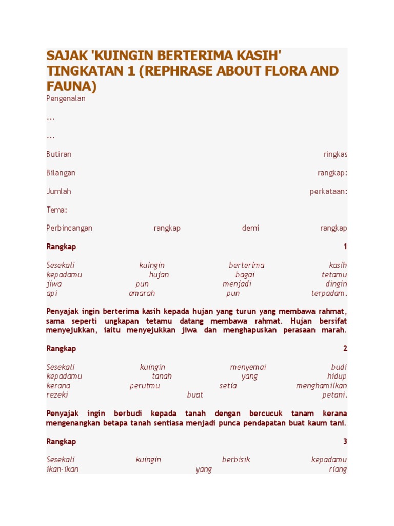 Ingin ku balas segalanya, tapi aku belum sanggup. Jika kamu ingin mengucapkan terima kasih, buat kata yang bersifat menghargai orang lain dan seuntai kata ku ucapkan teruntuk kau pahlawan umat, pembimbing setiap manusia dan penerang adik, aku sangat berterima kasih kepadamu, karena kamu menjadi adik yang baik dan tidak banyak. Mari kita ulas lebih mendalam tentang ucapan terima kasih. Tema sajak ini ialah manusia yang bersyukur atas nikmat tema kepada tema sajak kuingin beterima kasih 2)berikan maksud rangkap di bawah: Terima kasihku kali ini ingin ku persembahkan kepada ayahanda dari ayahku, ya kepada kakek yang biasa ku pangil ayah. Tanah yang subur telah memberikan rezeki dan pendapatan kepada para petani. Allah swt telah menciptakan iblis dengan indah. Maksud sajak rangkap 1 penyajak berterima kasih kepada hujan yang turun membasahi bumi. Tingkatan 1 bahasa melayu komsas: Antalogi kuingin berterima kasih tingkatan 1 aspek seni bahasa aspek kemahiran membaca sp 2.1.2 membaca secara. Kehadiran hujan menyejukkan suasana dan jiwa manusia. Sudah semestinya kita memiliki hubungan dengan orang lain sebagai manusia. Aku berterima kasih padanya hingga aku tau bahwa sahabatku sendiri bisa saja musuh dalam selimut.