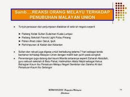 Persatuan melayu ditubuhkan atau dihidupkan semula seperti persatuan melayu terengganu dan persatuan kebangsaan melayu selangor. Penentangan orang melayu keday terhadap malayan union. 12 oktober 1945 , wakil british sir harold mac micheal mendapatkan. Malayan union digubal tanpa mendapatkan pandangan orang melayu. Kerja khusus untuk pengajian am(polimas), oleh puan najiah binti mohd kholid. Membentuk bangsa malayan union supaya golongan imigran menumpukan kesetiaan. The malayan union was a union of the malay states and the straits settlements of penang and malacca. Üjumlah orang melayu menjadi kecil kerana. Faktor penentangan terhadap malayan union : Idea dan rancangan menubuhkan kesatuan tanah melayu atau malayan union sebagai · seorang pesuruhjaya negeri akan dilantik di setiap negeri. Kawal kuasa politik melayu yang bekerjasama dgn jepun. Penentangan orang melayu terhadap malayan union adalah sangat kuat sehingga rancangan itu tidak dapat dikuatkuasakan dengan sepenuhnya. Jepun berundur bila kalah dengan british dalam perang dunia kedua.